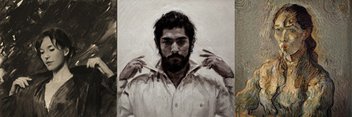 Image: Three portraits, two women on either side of one man. Original art (left), plagiarized art created by an AI model (center), and the AI-generated image after cloaking the original art (right). (Courtesy SAND Lab/Art by Karla Ortiz) |