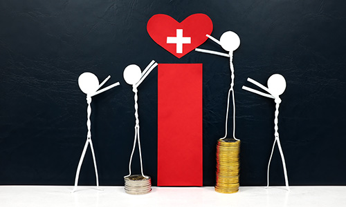 Image: Four stick figures—two standing on a stack of coins—reach for a red heart with white cross, a symbol for health care. (Pixabay/John Kevin) |