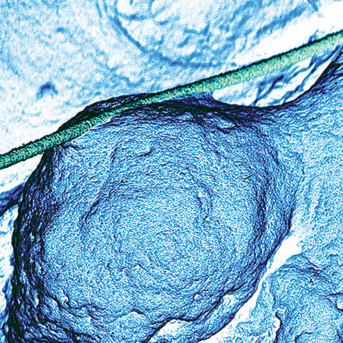 Image: Imagine a snowy mountaintop with a gondola cable straddling the peak, but on a nanoscopic scale. This scanning electron microscope image shows a neuron with a silicon nanowire, which works like a solar cell, perched on top. When a light is shined on it, the wire converts photons into electric energy, stimulating—or exciting—the neuron. |