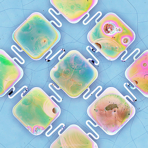 Image: The opalescent swirls on silicon membranes, as seen here under an optical microscope, aren’t created by dyes or pigments. The color comes from a process called stain etching, which eats through the surface of the silicon, leaving holes that scatter light, creating colored “stains.” But the process does more than cast psychedelic patterns—it creates nanoporous material that functions like a solar cell. |